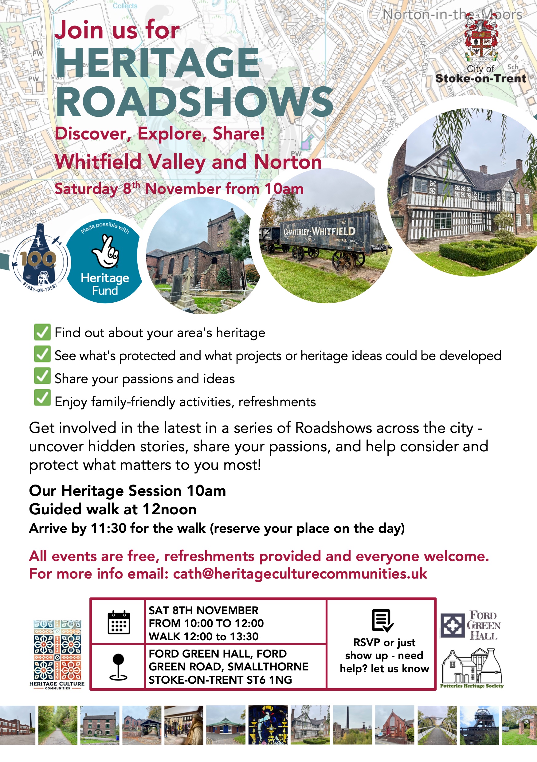 The Roadshow runs from 10am to 12 noon followed by a guided walk led by Potteries Heritage Society (places can be reserved on the day).