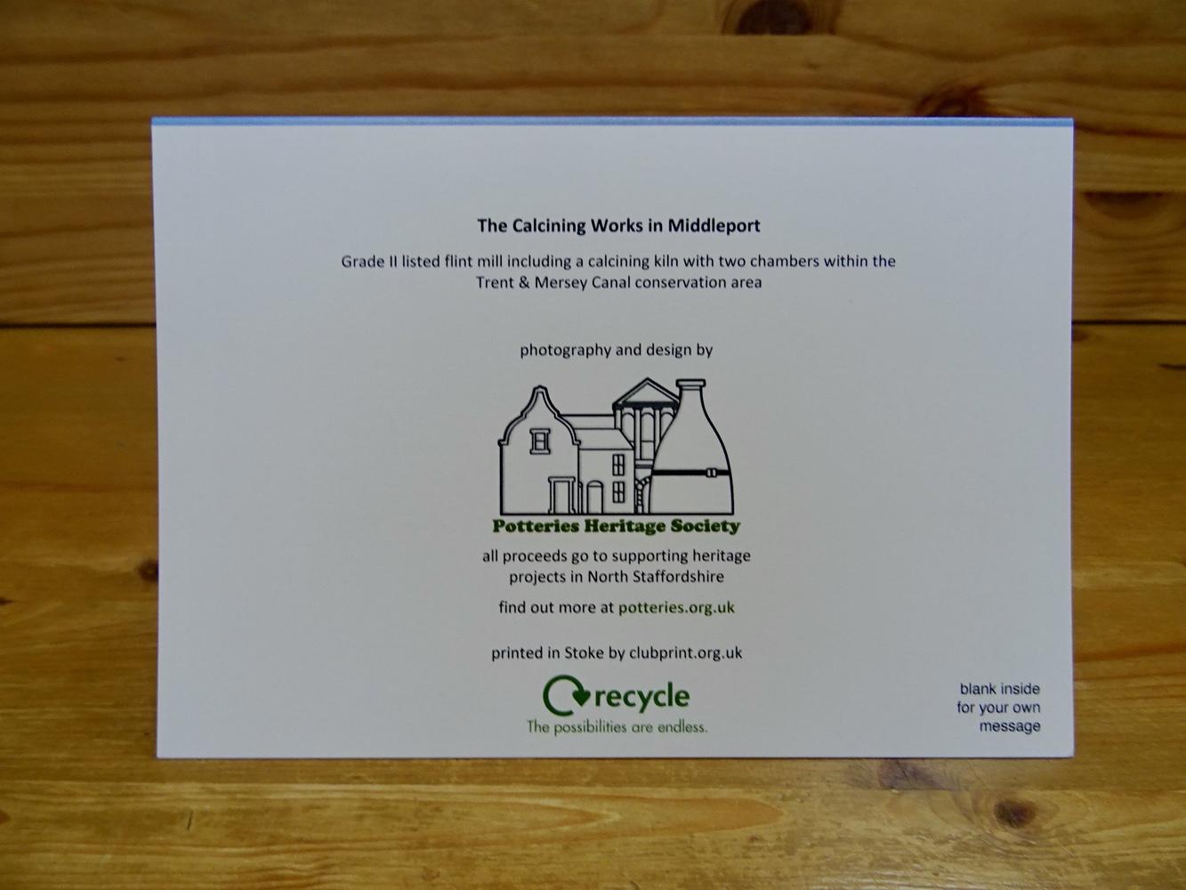 PHS Christmas Card with envelope. Photograph of the Calcining Works in Middleport in the snow. A6 size (150mm x 105mm). Blank inside for your own message. Price: £2.00 Quantity *